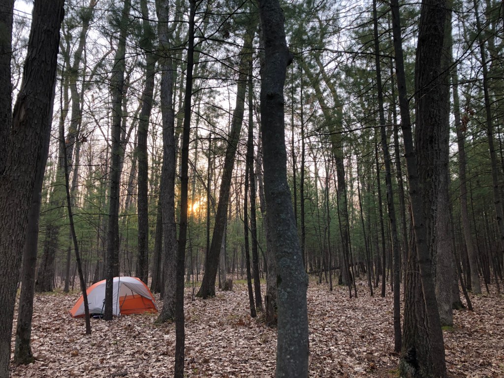 After the meadow, the trail runs high above the river on ridges so water is scarce. I had to get to the Red Bridge campsite for water. Feet feeling like hamburger, I was hiking the trail toward the road on which the campsite is located when I heard someone peeling out over and over. When I got there, I saw a man in a red hot rod had someone standing on the side of the road shooting video of him peeling out, in the middle of the Manistee National Forest. After one final, spectacular peel out, the forest was a haze of burning rubber. I’m always hesitant to camp near trailheads or on roads because they tend to attract people who want to party in the woods, or drag race, apparently. No judgments here. I spent most of my 20s partying in the woods (not drag racing, though) but sleep is a miracle drug when you’re backpacking and I need it. I was so worried, I considered getting water then hiking back to the trail to disperse camp somewhere away from the road, but my feet weren’t having it. It’d taken me 10 hours to hike 16 miles, and they were done.