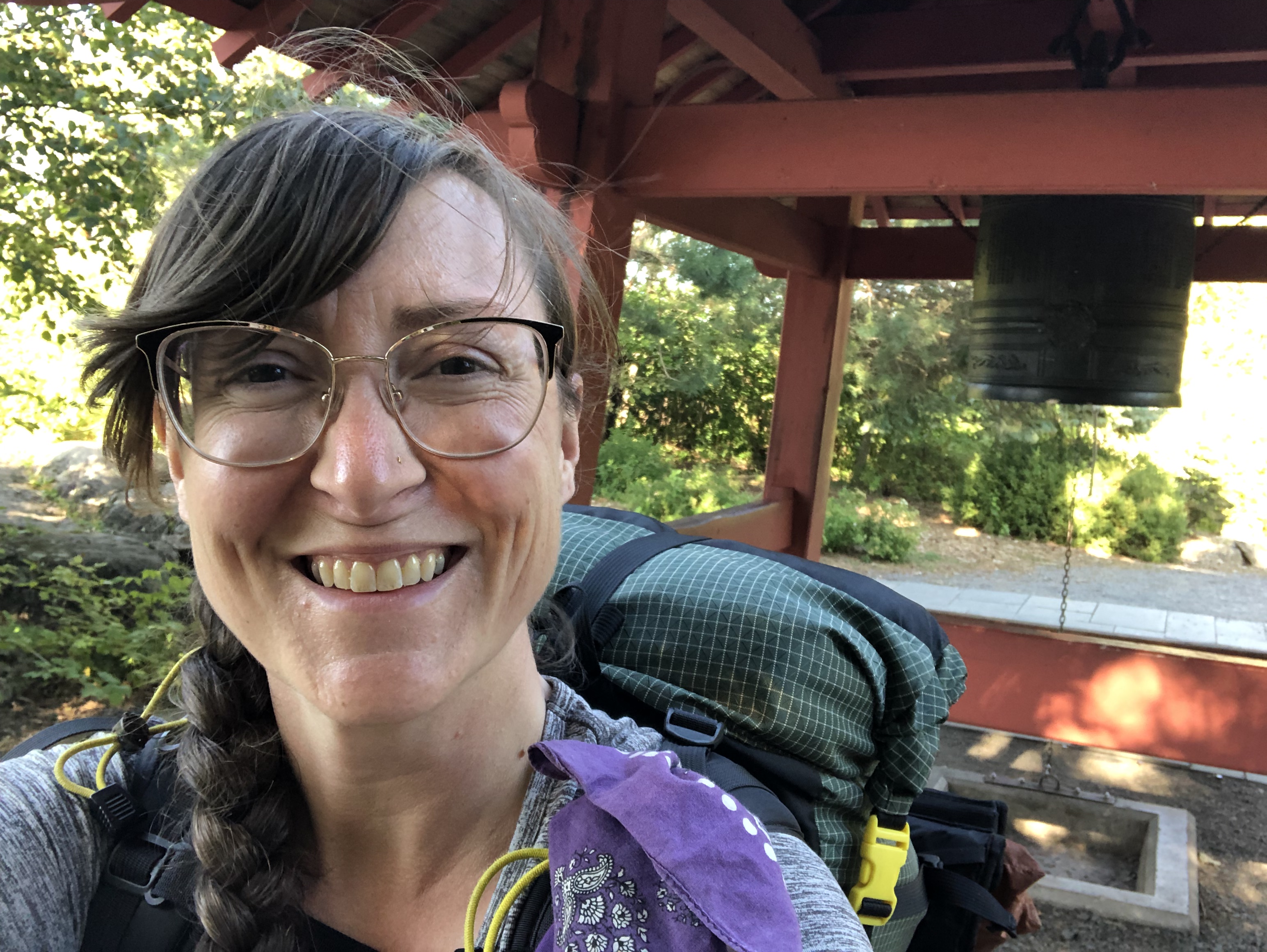 Annie with her backpack 1,200 miles into her long-distance hike on the North Country Trail.