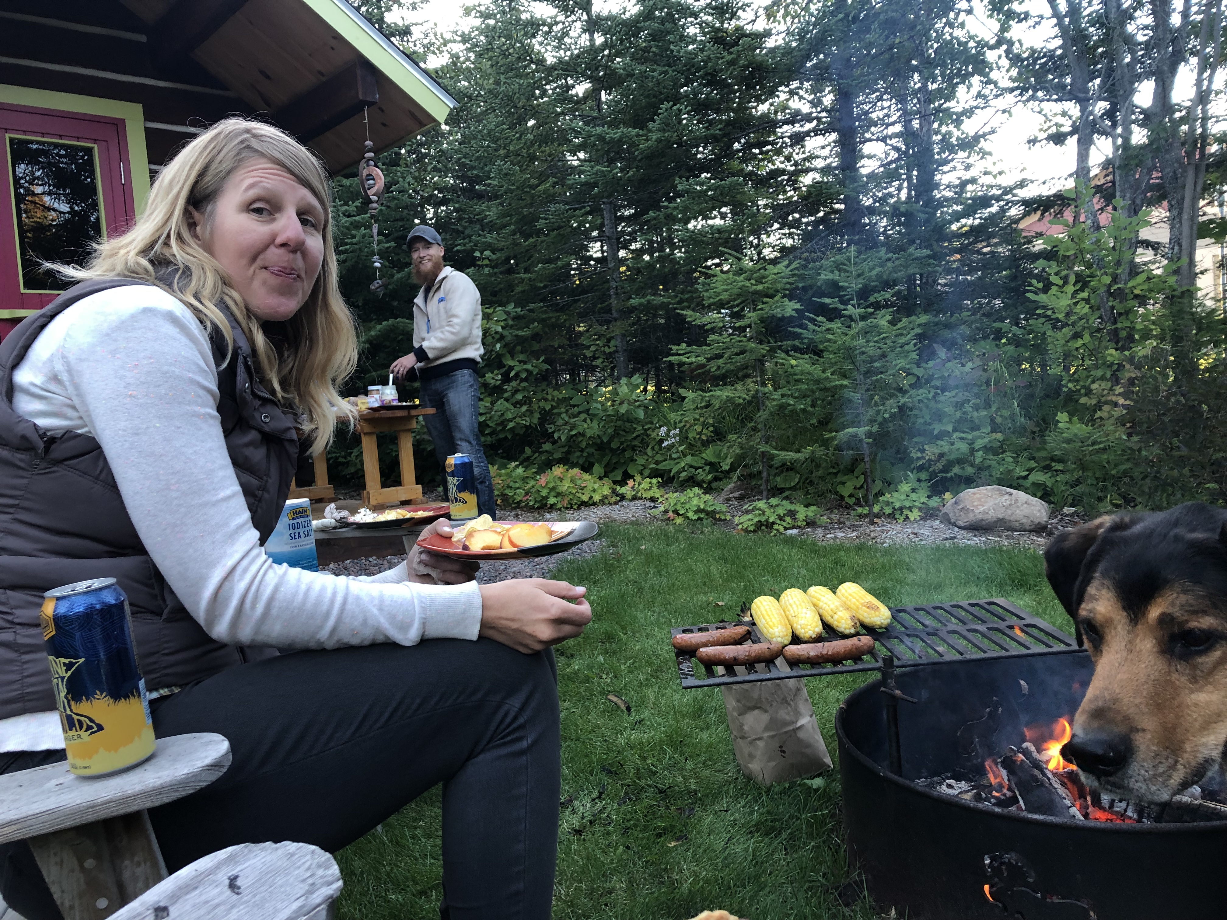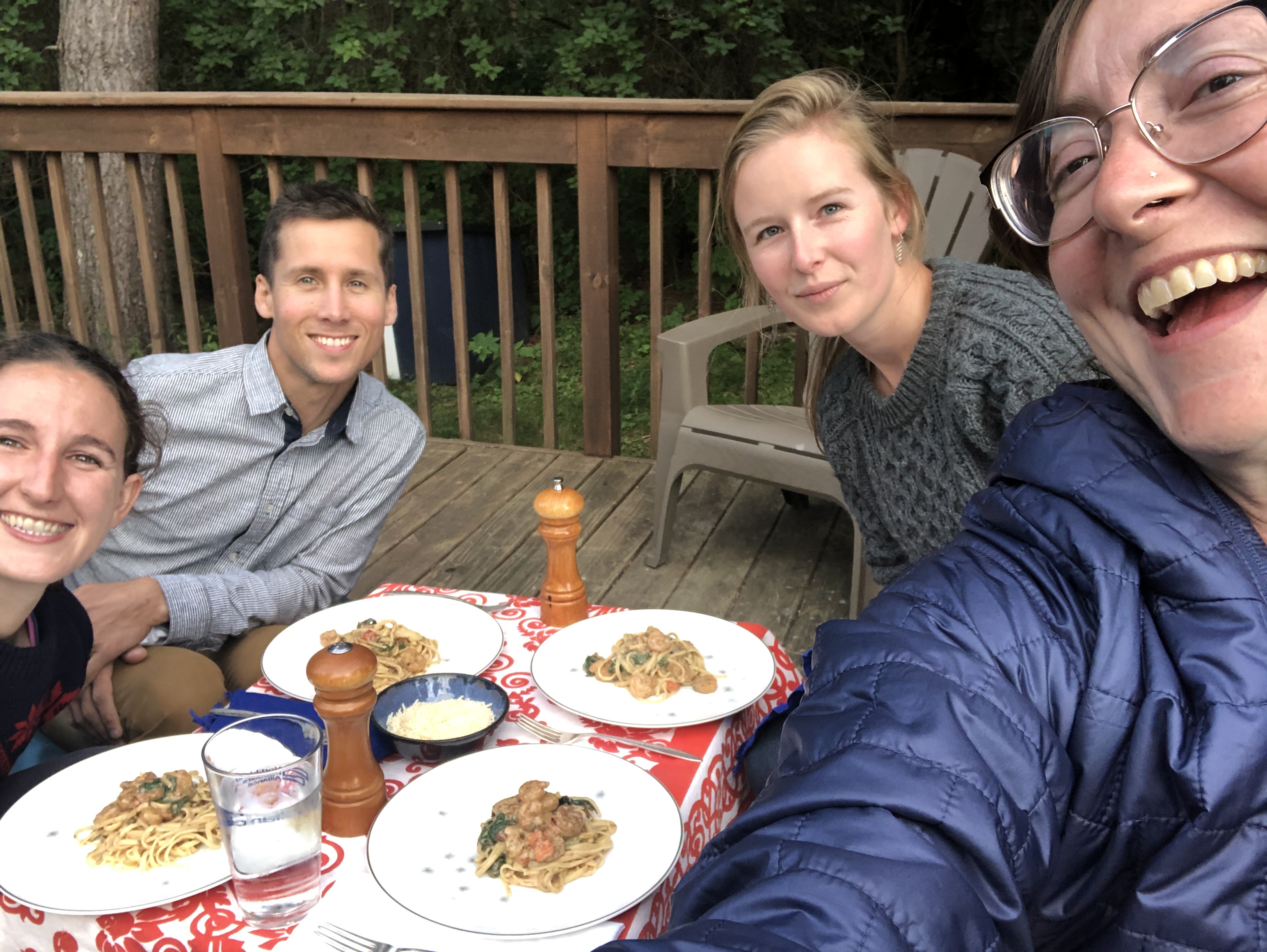 We chattered away about the woods, plants, and her upcoming wedding. She found a lobster mushroom at the end of our day. Then her future sister-in-law, Marika, picked us up, and hosted us for the night. We ate dinner on Marika and her fiancé Biagio’s back deck: pasta with a white sauce, lobster mushrooms, roasted red pepper and shrimp.