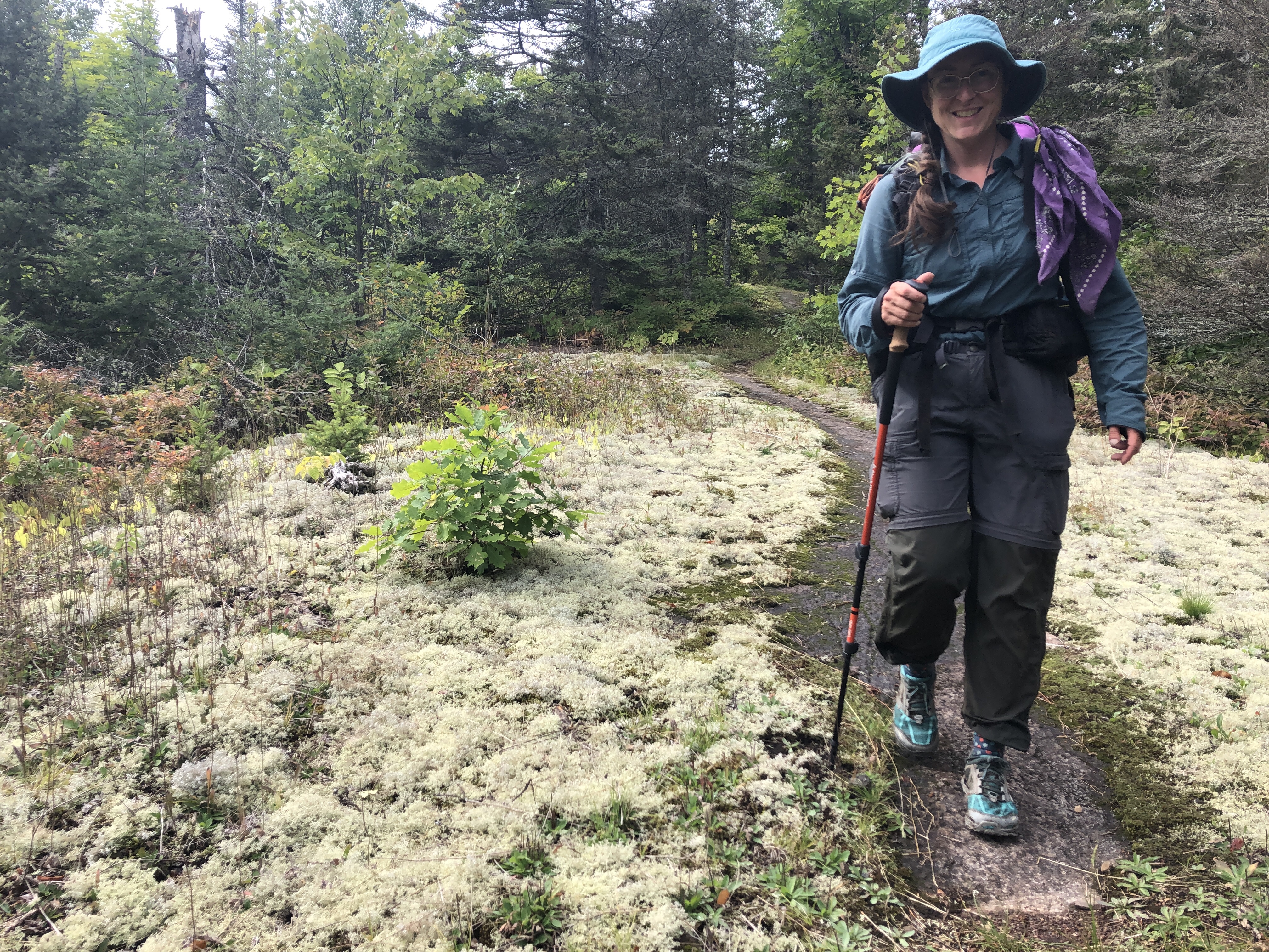Hiking on a lichen-covered boulder on the stretch of trail between Duluth and Two Harbors.