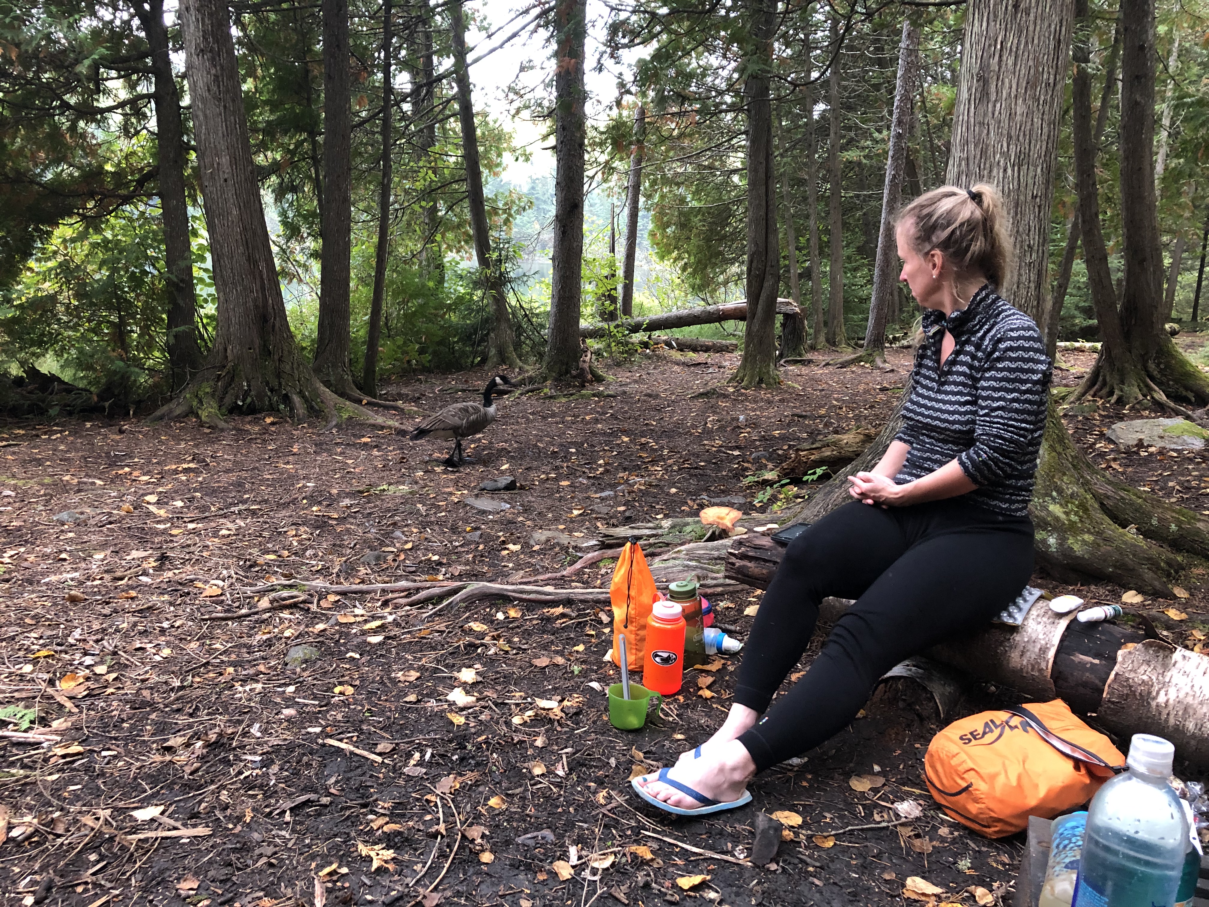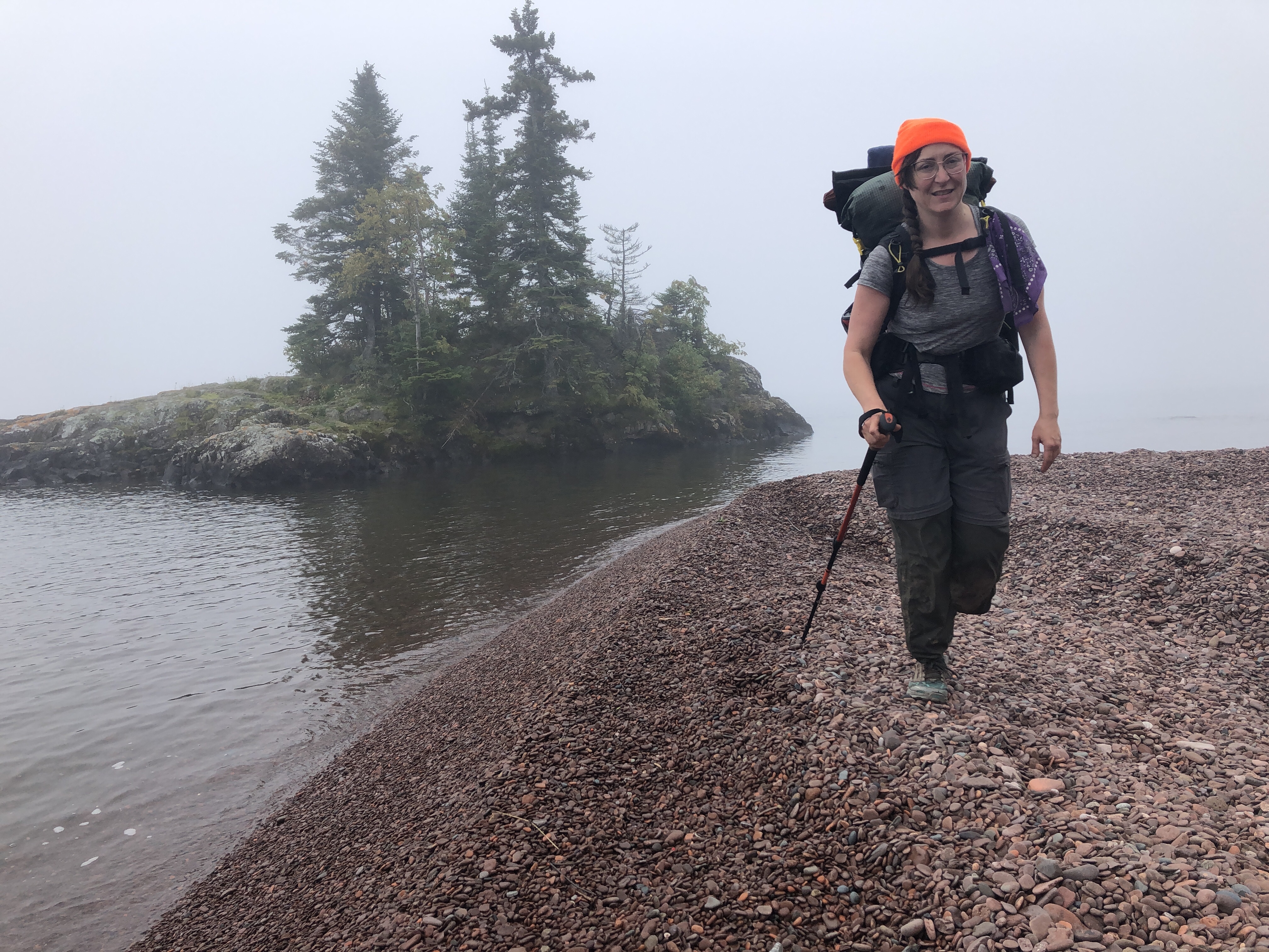 Caroline hiked about half the next day with me. Near the Lone Tree campsite, we heard something charging out of the woods, and then saw the buck heading right for us. Without thinking, I sprinted out of its path right into Caroline. I wish I could say I was throwing myself heroically in front of her, but no. I was just running to get out of the way. As soon as the buck saw us, it pivoted without breaking stride, a doe following hot on his heels. We watched the woods, expecting whatever was chasing the deer to suddenly appear. Wolves? But nothing appeared, and we started laughing, a specific, relieved laugh for when you thought you were about to be charged by a carnivore, but it all turned out OK.