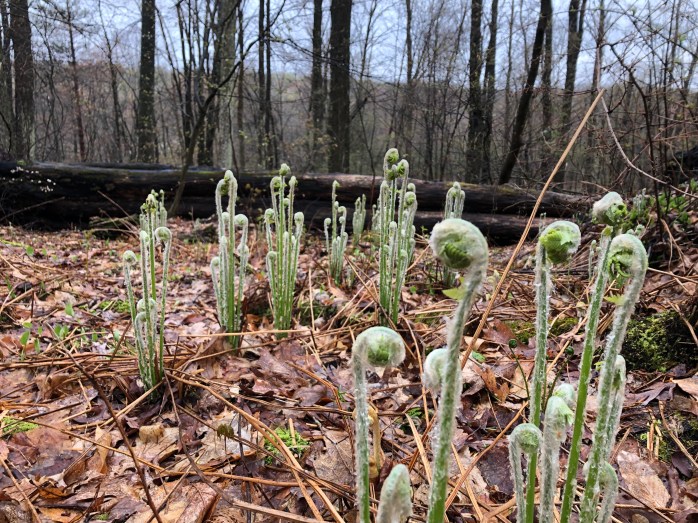 The next day’s hiking brought me through a series of Costal Plains Marshes requiring several wet-foot crossings. Now this is starting to feel like home, I thought! The marshes were bursting with new life: ferns with tightly curled fiddle heads, Marsh marigolds already blooming, butterflies, bees, midges, and dragonflies. No mosquitos are out yet, and I haven’t found a single tick so far.